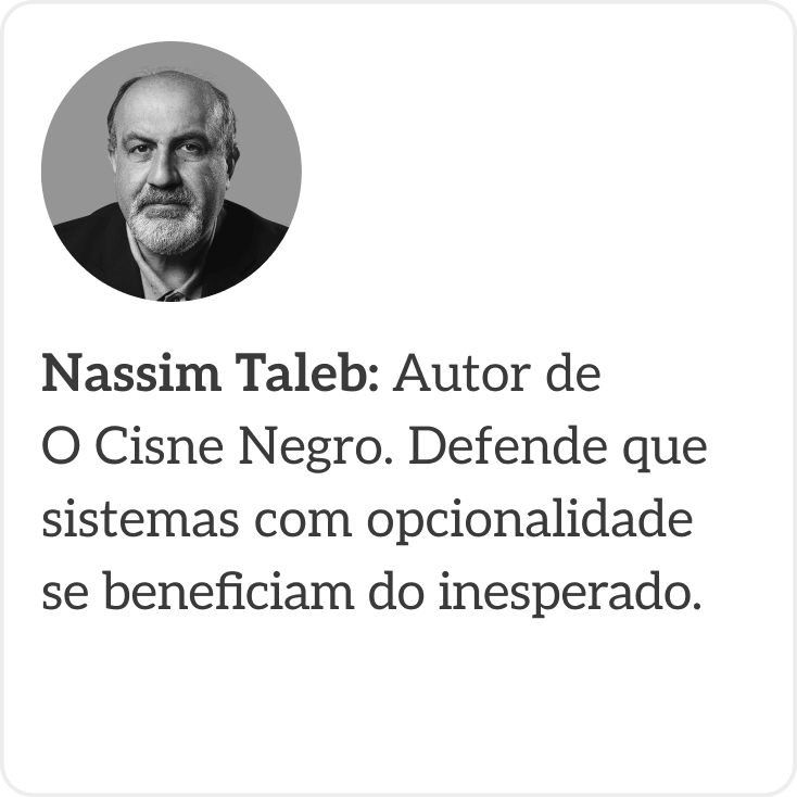 Nassim Taleb, autor de Antifrágil e O Cisne Negro, também trata a opcionalidade como um ativo valioso em si, ou seja, como a habilidade de se beneficiar de eventos imprevistos sem depender de previsões objetivas. Segundo ele, estruturas com opcionalidade são convexas: erram com perdas pequenas e acertam com ganhos expressivos.